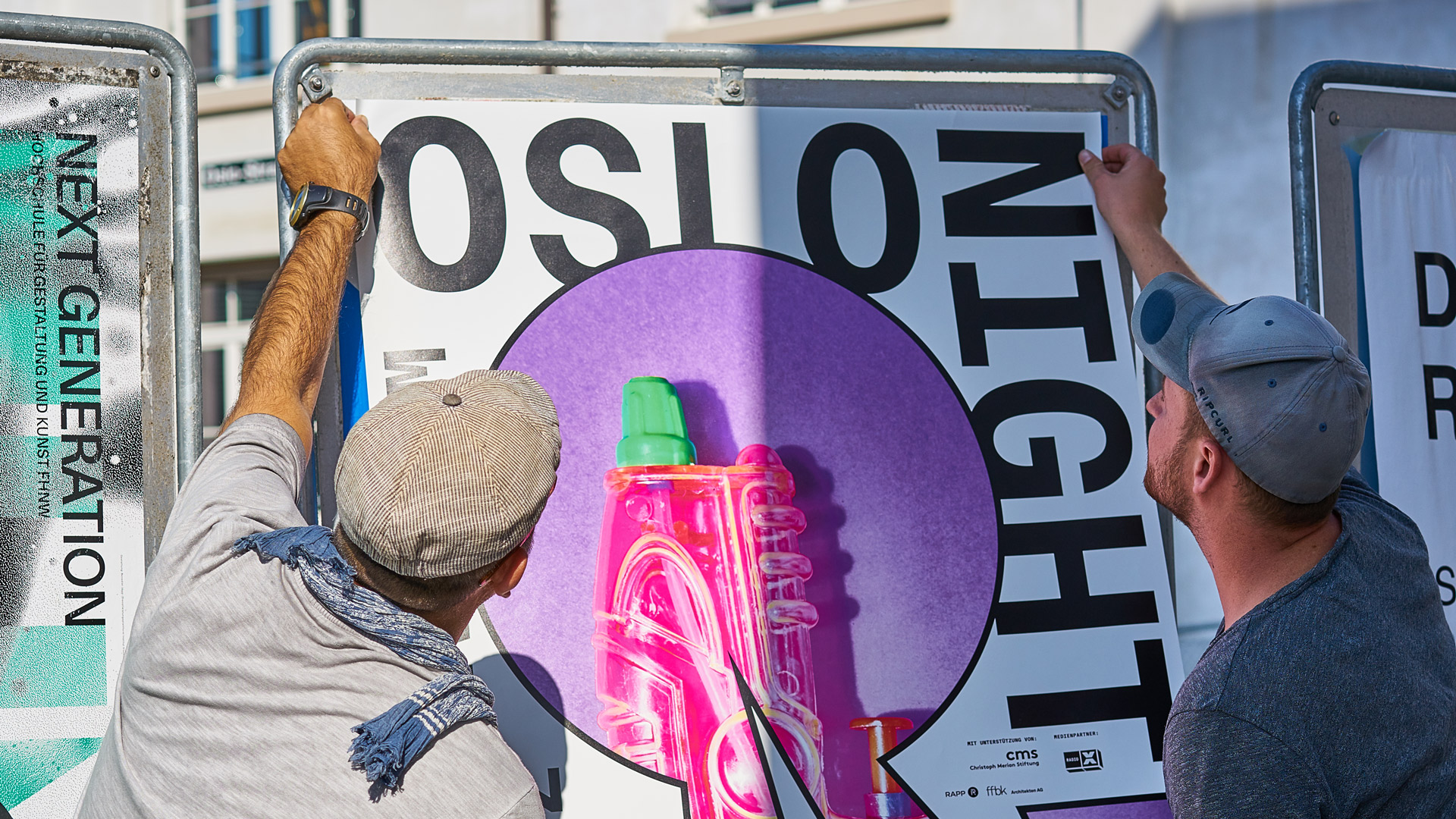 Oslo Night, a one-day culture festival in Basel, asked us to develop a new poster system for the yearly festival. We created a strong graphical layout evolving around a shape combining the letters O and N. The shape can be seen as a keyhole into the festival. The shape contains the key visual of the year, which for the first year was freshness and fruits, and for the second year was waterguns. We designed posters in A3 to F4 format, flyers, stickers and a wayfinding system so the visitors could find the specific events during the festival.
