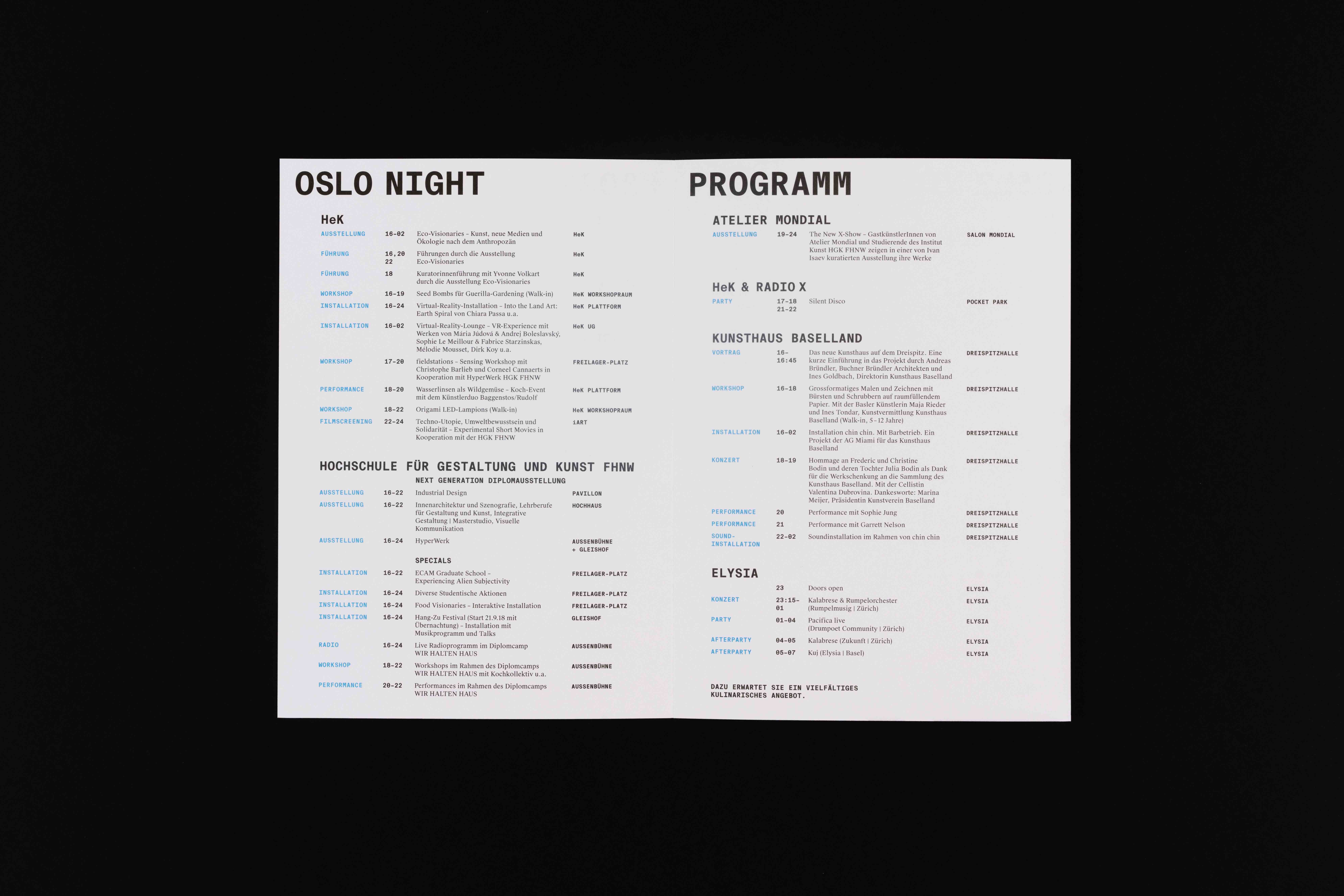 Oslo Night, a one-day culture festival in Basel, asked us to develop a new poster system for the yearly festival. We created a strong graphical layout evolving around a shape combining the letters O and N. The shape can be seen as a keyhole into the festival. The shape contains the key visual of the year, which for the first year was freshness and fruits, and for the second year was waterguns.